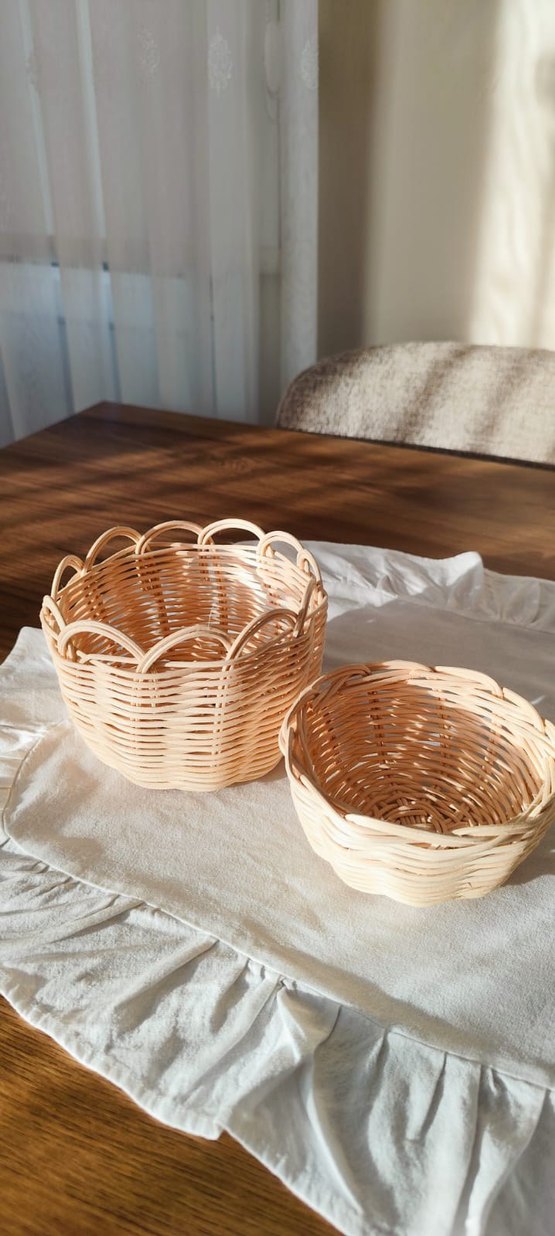 Hafif bej renginde, doğal dokulu örgü sepetler, saklama ve düzenleme için uygundur. Mekâna sıcak bir hava katar.