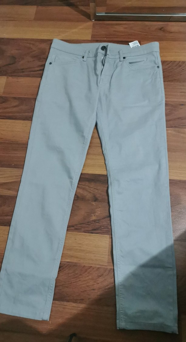 Gri renkli, regular fit kesime sahip, kemerli ve normal boyda erkek denim pantolon. Günlük sokak stili için uygundur.