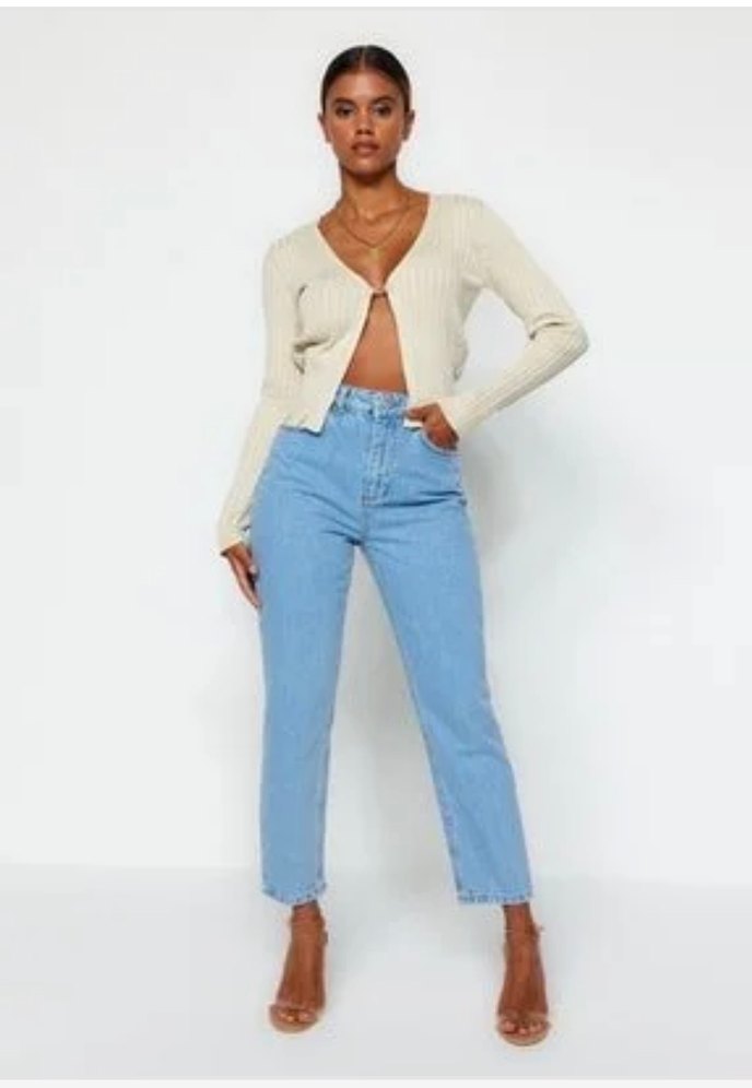 Bej renkli, regular fit, midi boy denim kadın jean. Rahat ve şık, günlük kullanım için uygun bir sokak stili sunar.