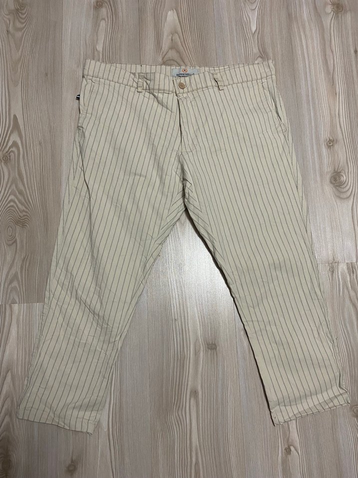 Bej renkte, regular fit kesim keten erkek pantolon. İnce gri çizgili ve pileli detaylara sahiptir. Günlük kullanıma uygundur. Ürünün son Fotoğrafta olduğu gibi küçük bir boya lekesi tarzında bir lekesi vardır onun dışında bir sorunu yoktur. Ürün 50 bedendir. Bel ölçüsü 48 cm dir. Bacak boyu 81cmdir