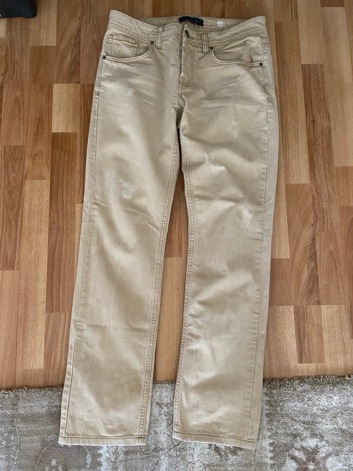 Bej renkte, keten kumaştan yapılmış, regular fit ve normal boy erkek pantolonu. Tokalı detayıyla günlük ve sokak stiline uygun.
