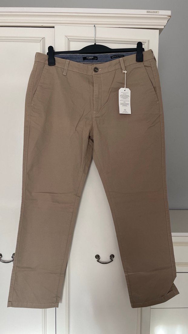 Bej renk, regular fit ve normal boy uzunluğunda pamuklu erkek pantolon. Düz desensiz, günlük kullanıma uygun rahat bir tasarım sunar.
