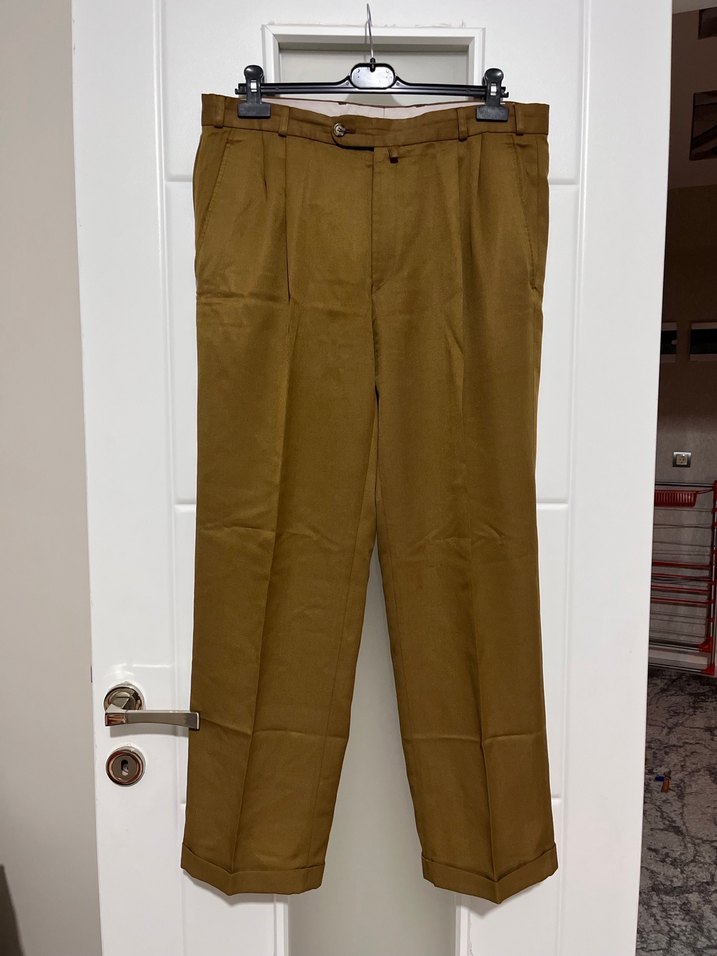 Bej renkli, regular fit kesim, kemerli ve parlak görünümlü süet erkek pantolon. Normal boyda, ofis ve günlük kullanıma uygun. EU48 beden