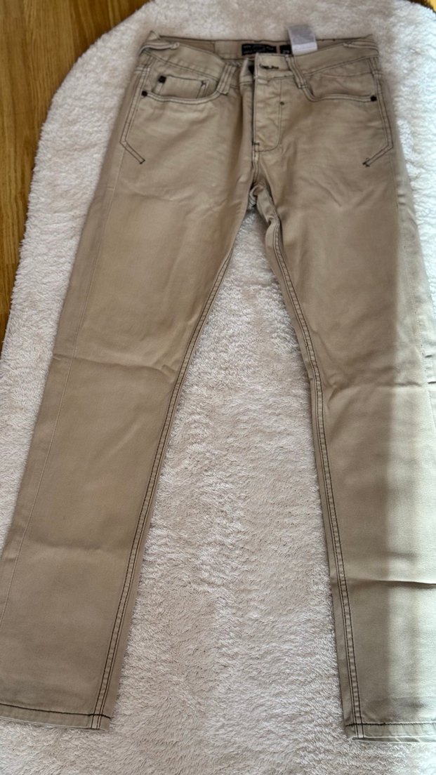 Bej renkte, kemerli, regular fit erkek pantolon. Düz desensiz, yumuşak sentetik kumaştan, günlük rahat kullanım için uygundur.