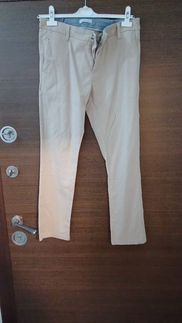 Bej renkte, regular fit kesim ve normal boyda, rahat sentetik kumaştan yapılmış erkek pantolonu, günlük kullanım için uygundur.