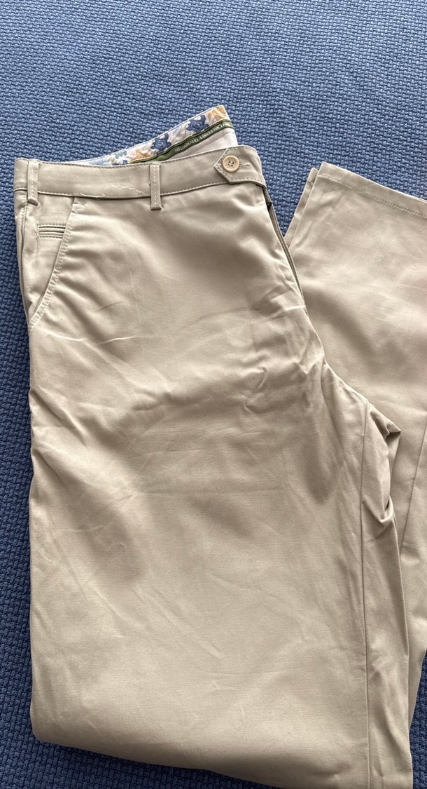 Bej renk regular fit, erkek pantolon.Pamuklu kumaş Tam numara bilemiyorum o nedenle metreyle ölçtüm (46 numara gibi) iki küçük kusuru var son 2 fotoğraf gözüküyor Meyer markası Hiç kullanılmamış etiketi yok.