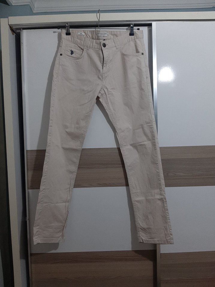 pamuk kumaştan, kemerli bel yapısına sahip bej renkli regular fit erkek pantolon. Günlük ve sokak stiline uygundur.