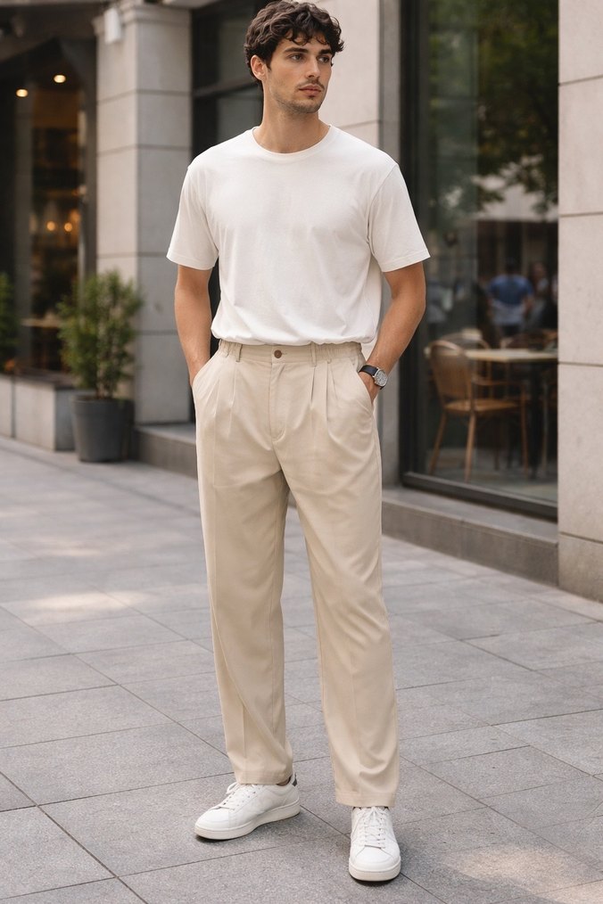 Bej renkte, pamuk kumaştan, regular fit ve normal boyda erkek pantolon. Günlük rahat ve şık stil için uygundur.