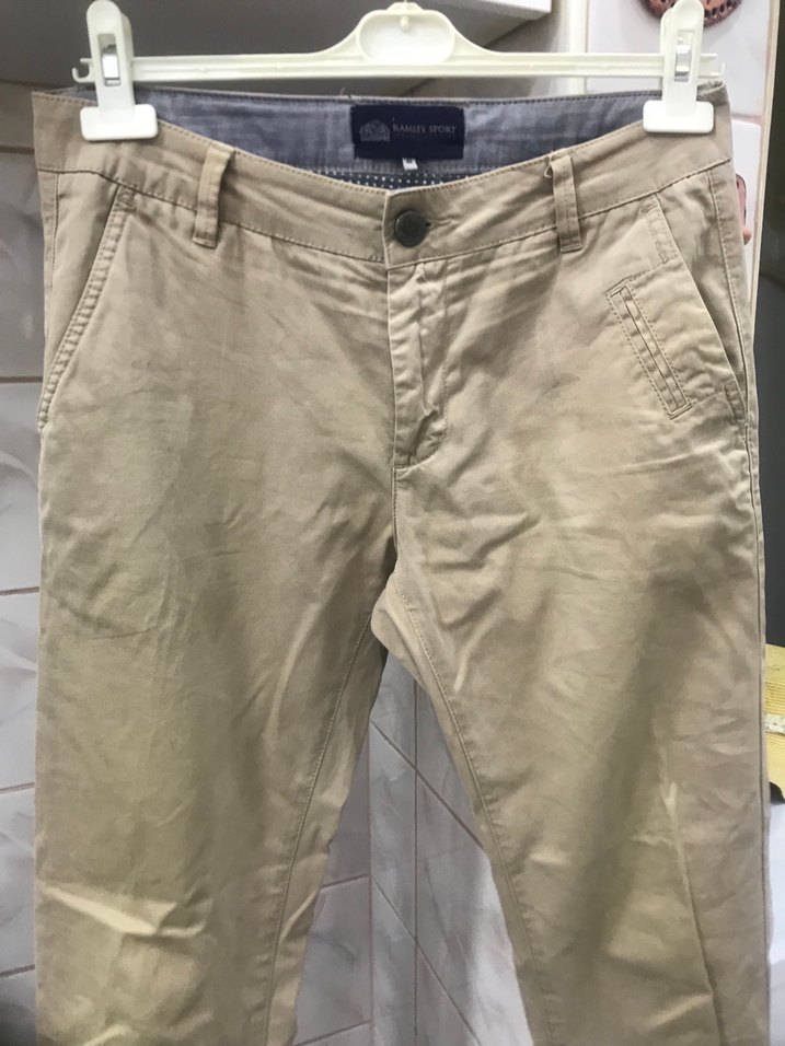 Bej renkli, düğmeli ve regular fit kesime sahip erkek pantolon. Yumuşak sentetik kumaştan üretilmiş, midi boyda ve günlük kullanım için uygundur.
