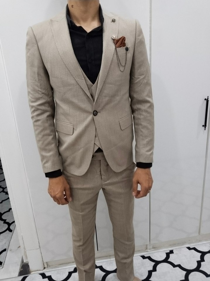 Bej renkli, regular fit kesim erkek takımı. Düğmeli, yaka tipi notch lapel, kolsuz ve midi boy. Ofis ve sokak stiline uygun, desensiz ve gri tonlu detaylar içerir. ️