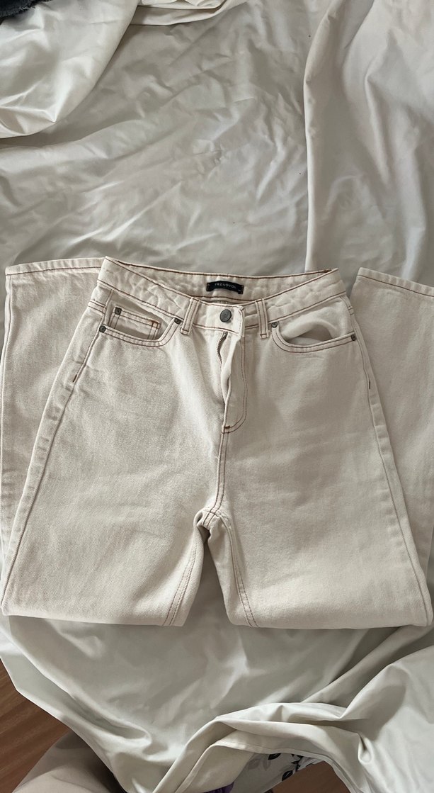 Yumuşak pamuk kumaştan yapılmış bej renk regular fit kadın jean. Normcore tarzda, midi boy ve desen içermeyen tasarımıyla günlük kullanım için uygundur.
