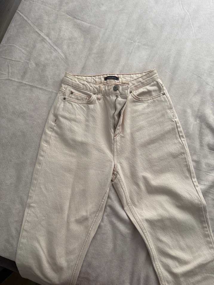 Bej renkte, pamuk kumaştan yapılmış, normal boyda ve regular fit kadın kot pantolon. Minimalist ve gündelik tarz için uygundur, desen içermez.