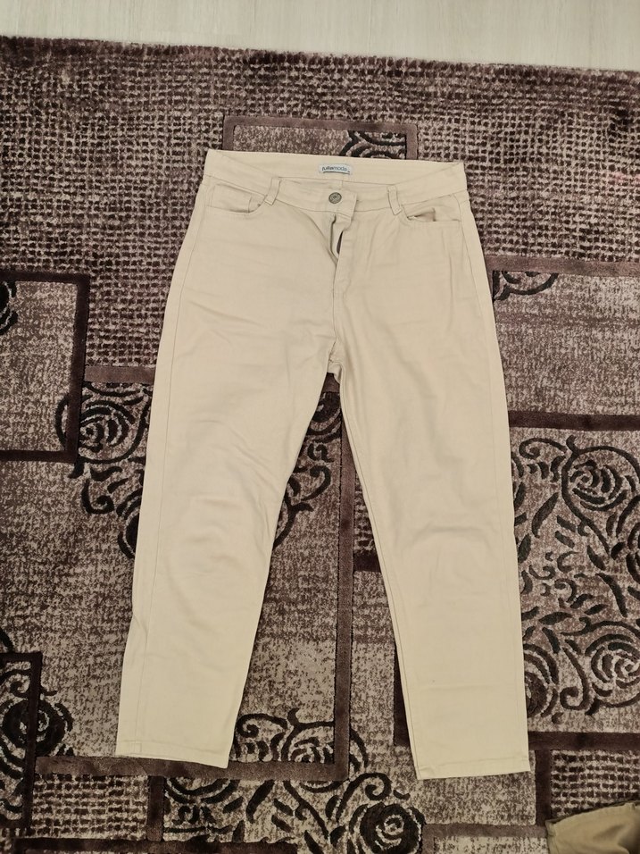 Bej renkli, kot kumaştan üretilmiş, regular fit ve midi boy kadın pantolon. Rahat ve şık, günlük kullanım için uygundur.