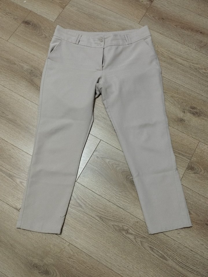 Bej renk, regular fit kesim ve midi boyda kadın kumaş pantolon. Düz desensiz ve sentetik dokulu kumaştan, günlük kullanıma uygun rahat bir şıklık sunar.