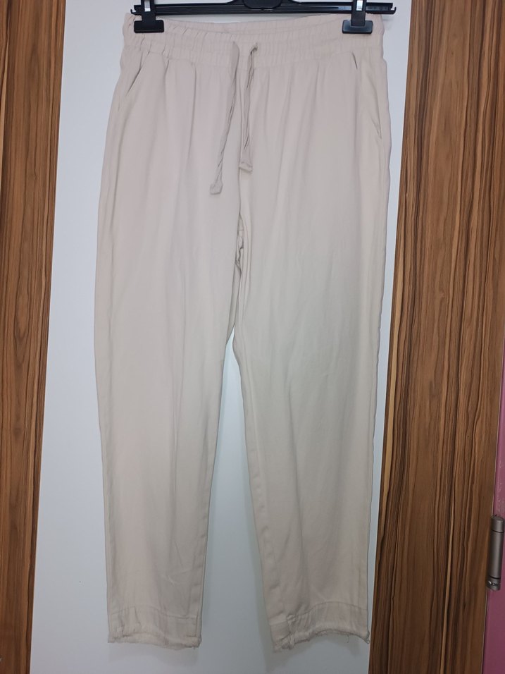 Bej renkte, regular fit kesim, midi boy kadın kumaş pantolon. Bağcıklı beli ve düz deseniyle günlük rahatlık sağlar. Hic giyilmedi
