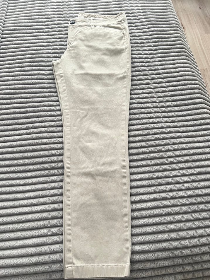 Bej renkli, koton kumaştan yapılmış, fit kesim kadın pantolonu. Günlük kullanıma uygun, normal boyda ve sade tasarımlı.