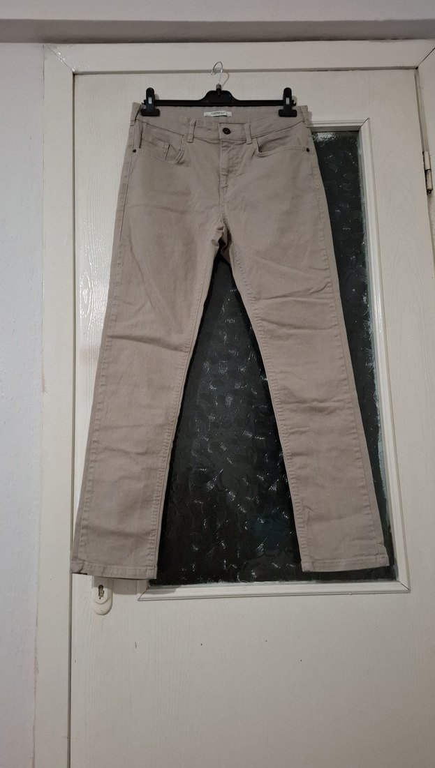 Bej renkte, kemerli ve regular fit erkek pantolon. Sentetik kumaştan, desensiz, günlük kullanıma uygun normcore tarzında. Bel 43 boy 106 cm