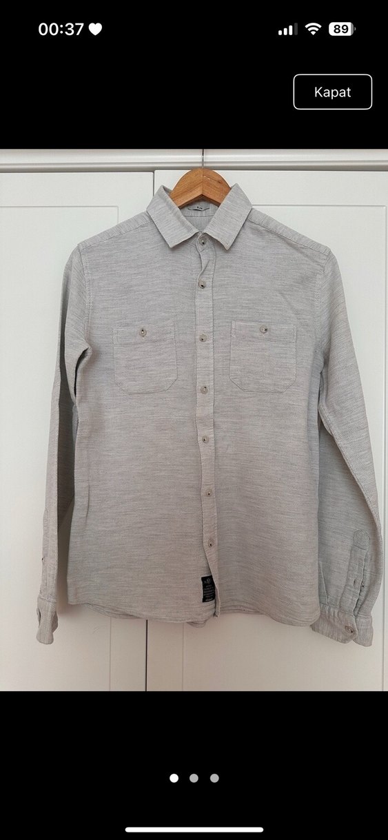 Uzun kollu, düğmeli önü ve iki göğüs cebi bulunan keten erkek gömlek. Bej renkte, desen içermeyen, rahat kesimli ve günlük sokak stili için uygun.