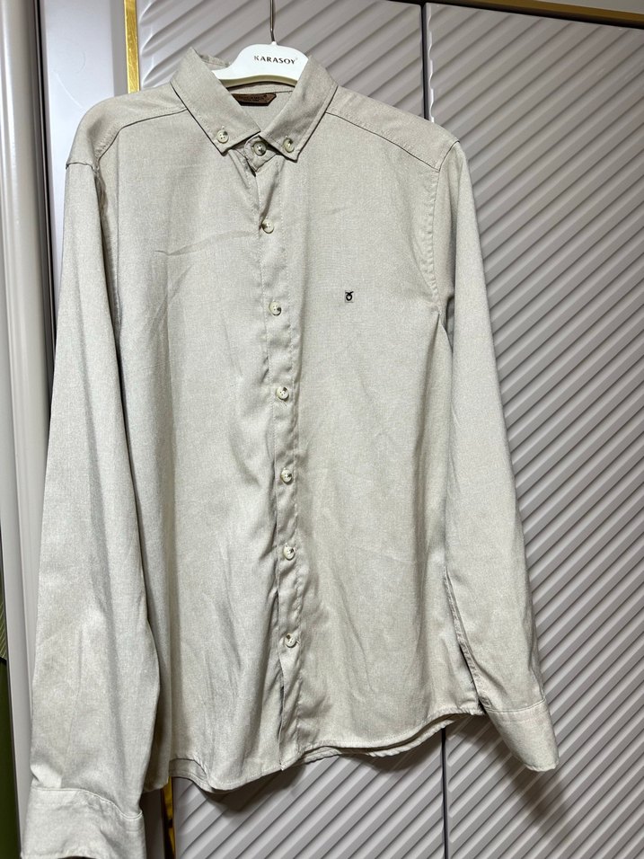 Uzun kollu, düğmeli, keten kumaştan bej erkek gömlek. Notlu yaka ve regular fit kesimiyle günlük sokak stiline uygun.