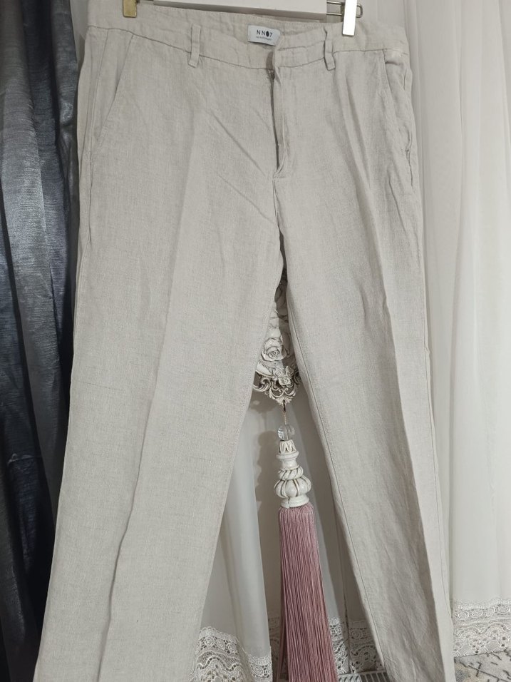 Yumuşak keten kumaştan yapılmış bej renkli, regular fit erkek pantolon. Düğmeli ve ofis ile gündelik kullanıma uygun.