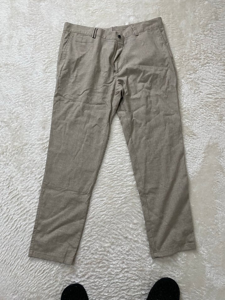 Bej renk, regular fit kesim keten pantolon. Düz desensiz ve midi boyda, günlük rahat sokak stili için uygun, zahmetsiz şıklık sunar.