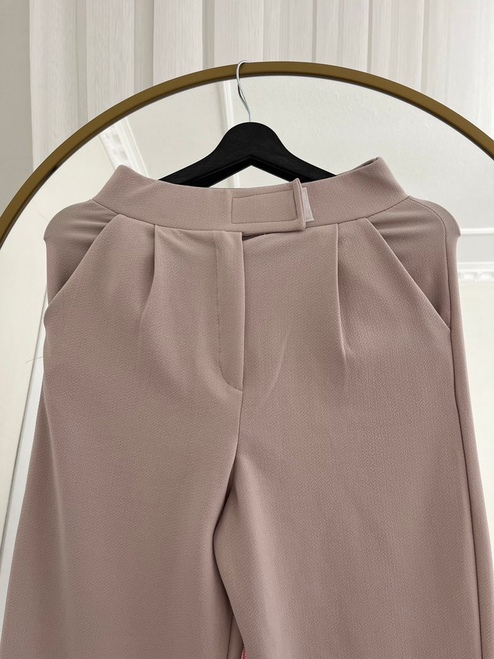 Bej renkte, regular fit ve midi boyda, pilili detaylara sahip kadın kumaş pantolon. Yumuşak sentetik kumaştan, minimalist ve çağdaş tarzda, ofis için uygun.