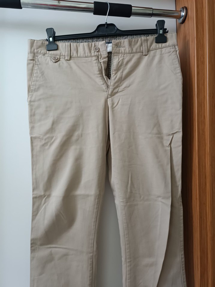 Pamuklu kumaştan yapılmış bej renkte regular fit erkek pantolon. Kemerli, desensiz ve midi boyda, günlük kullanıma uygun normcore tarzda.