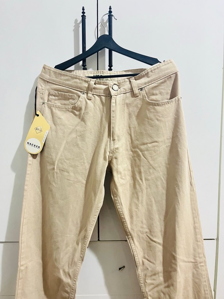 Bej renkli, pamuklu erkek kot pantolon keten aşırı rahat kesim etiketli duruyo pazarlık yaparız