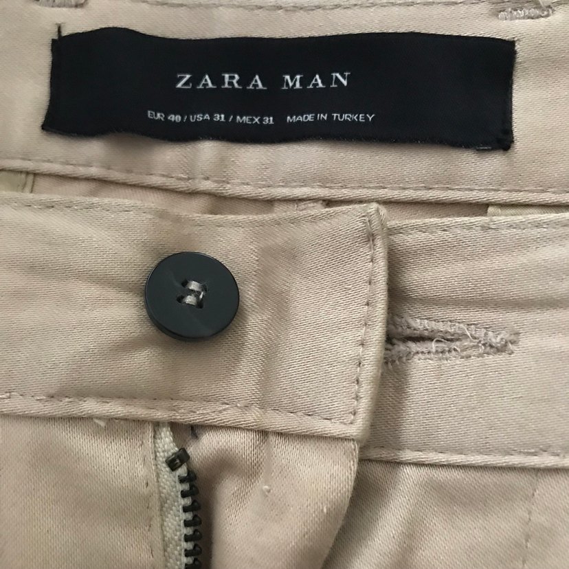 ZARA MAN markalı, düğmeli bej pamuklu erkek pantolon. Regular fit ve normal boyda, günlük sokak modasına uygun baskılı desenli.