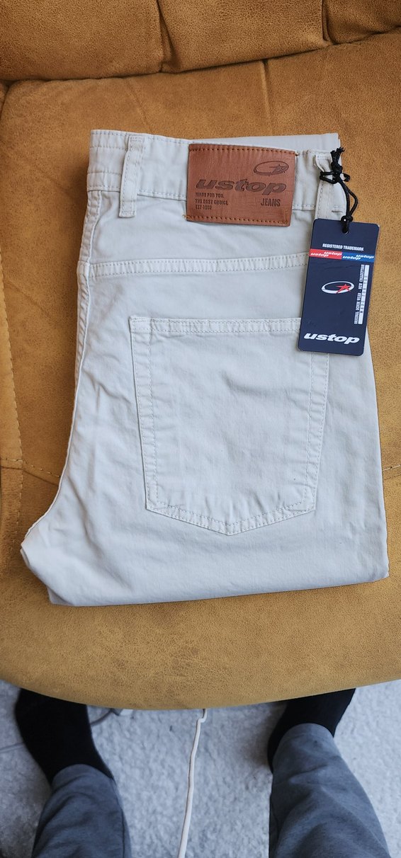 Yumuşak pamuklu kumaştan yapılmış bej renkte, fermuarlı detaylı ve normal boyda regular fit erkek pantolonu.