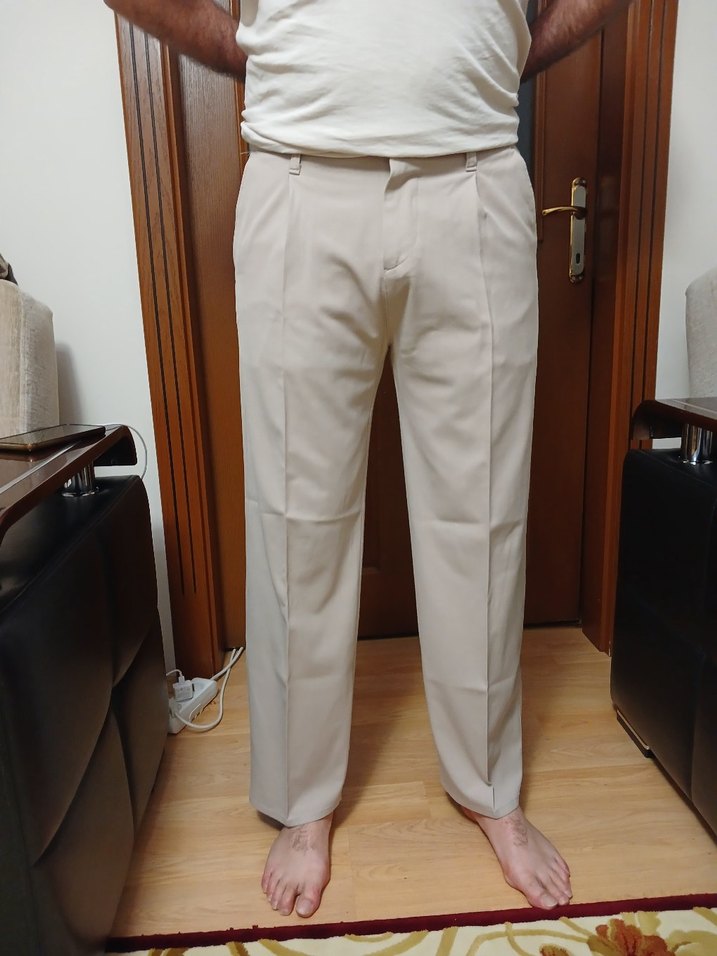 Bej renkli, regular fit ve pilili erkek pantolon 185 boy 80 kilo icin fotograftaki gibi oluyor