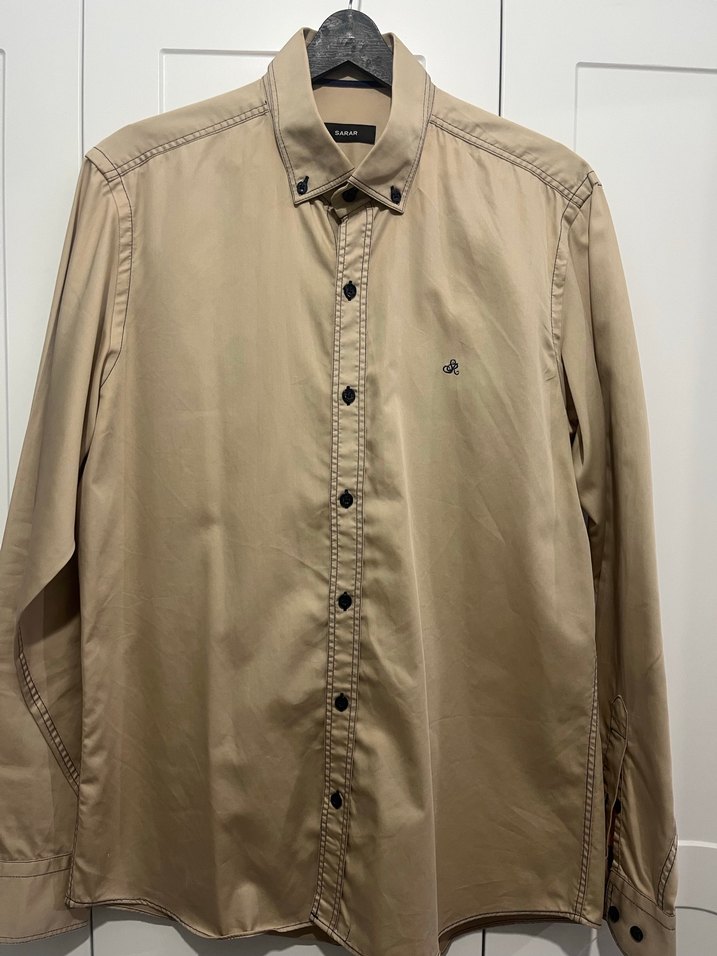 Bej renk, uzun kollu, çıtçıtlı ve notalı yaka detaylı erkek gömleği. Parlak sentetik kumaştan, regular fit ve ofis kullanımı için uygundur.