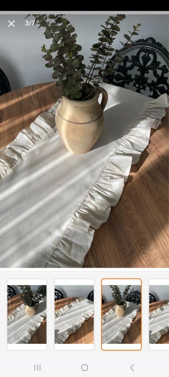 Bohem tarzda, bej keten kumaştan yapılmış, etrafı fırfırlı yumuşak ve zarif runner.
