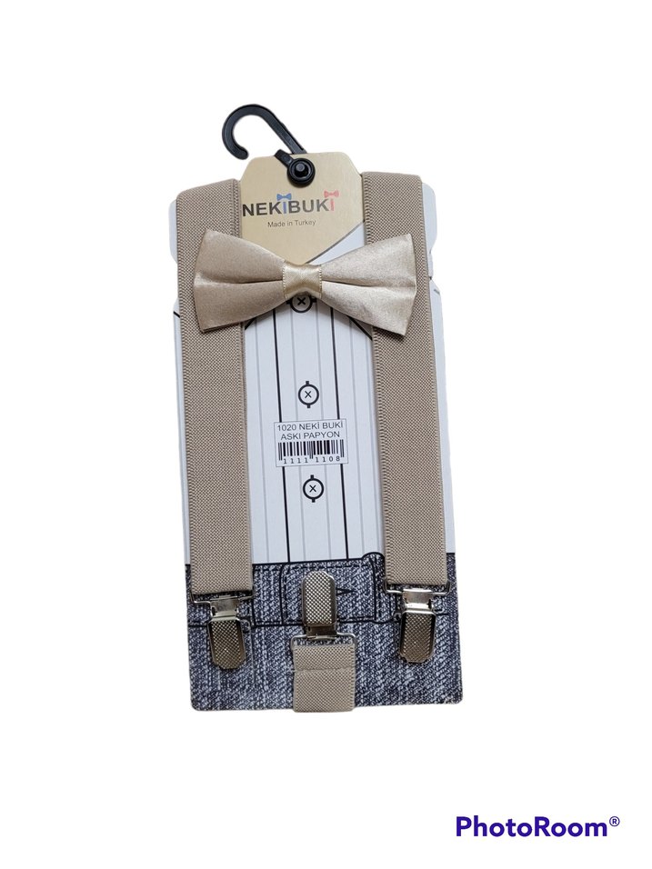 Bej rengi Çocuk Pantalon askısı ve papyon takım.