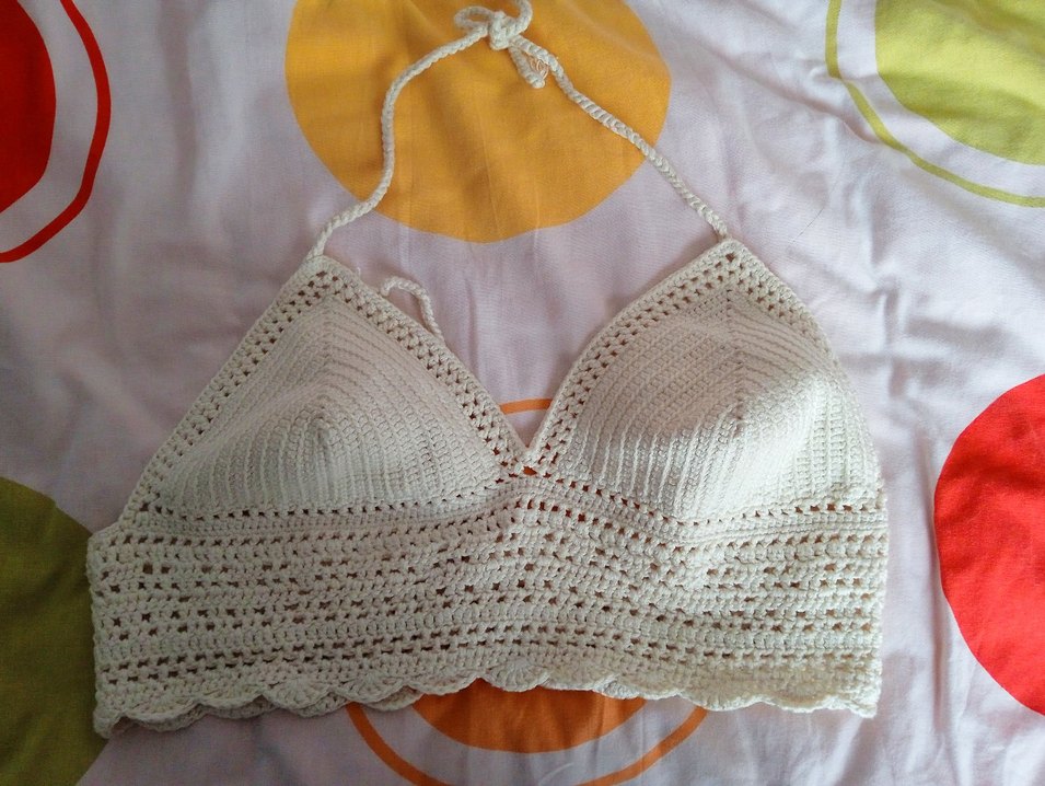 Bej renkli, dantel detaylı örgü büstiyer. V yaka ve askılı, bohem tarzda, günlük kullanıma uygun, vücuda oturan kesimde. Kendi el örgümdür. Hiç kullanılmadı. 40-42-44 bedene uyabilir.