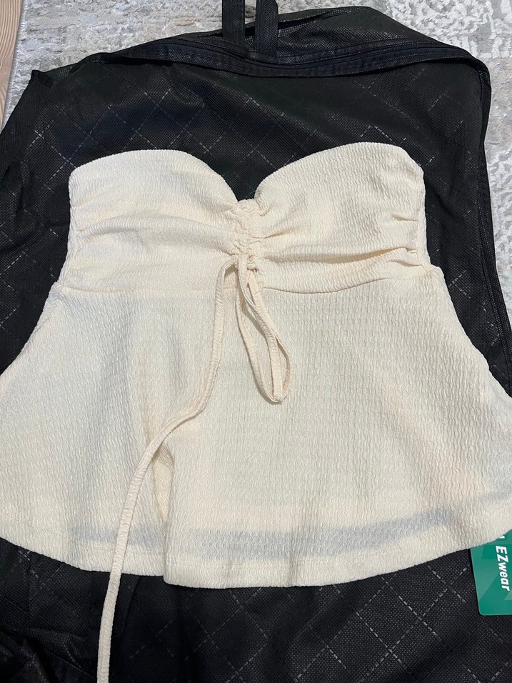 Beyaz renk, kısa mini boy ve vücuda oturan kesime sahip büstiyerÖnünde büzgülü bağlama detayı bulunur. Desensiz, hafif dokulu kumaştan üretilmiştir.