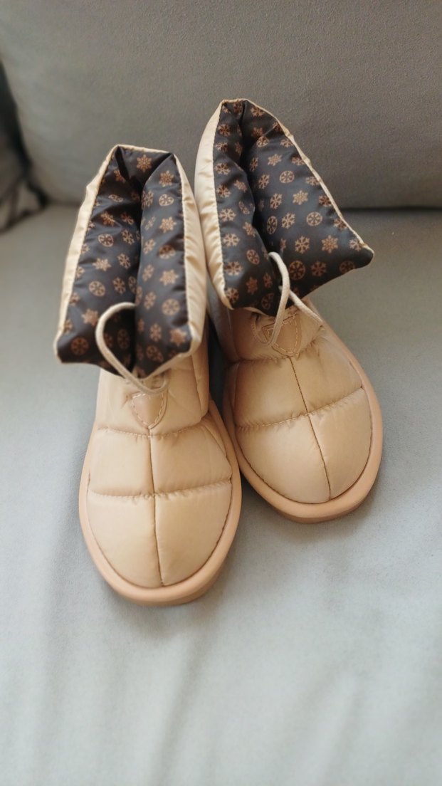 bej rengi parlak kauçuk malzemeden dolgu topuklu kadın botları, rahat dolgulu tasarımla günlük sokak stiline uygun.
