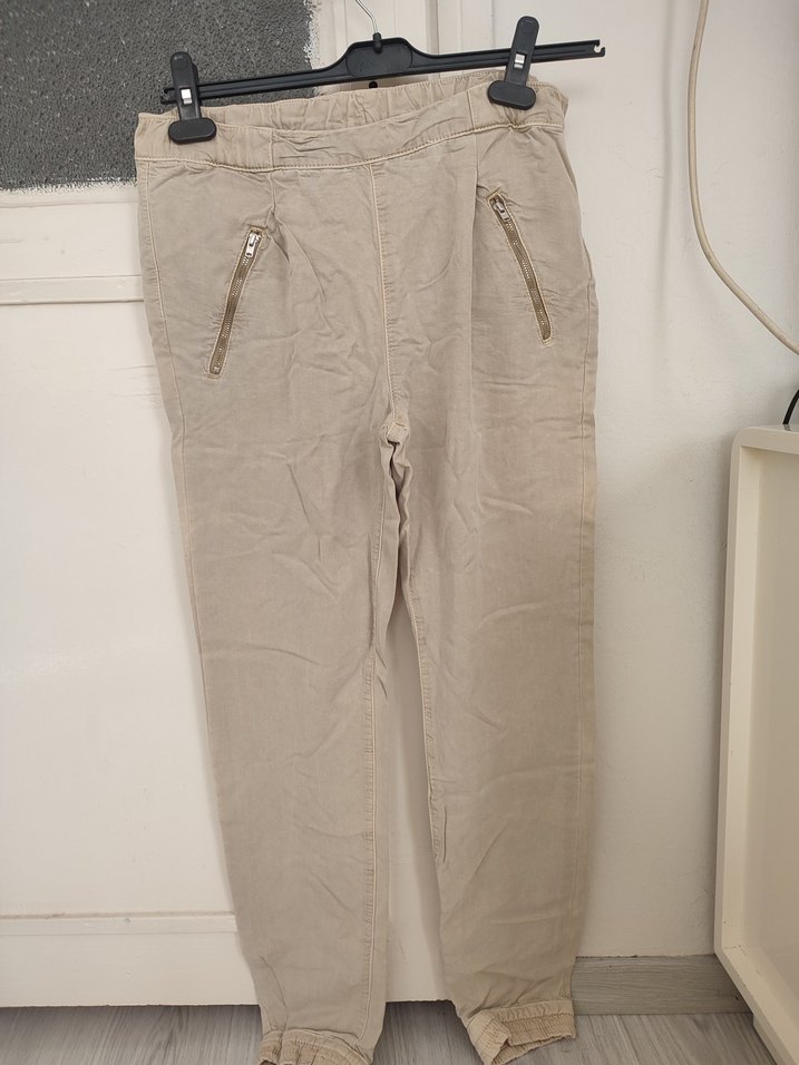 Bej renk, lyocell kumaştan, rahat kesim ve fermuarlı ceplere sahip kadın pantolonu. Günlük kullanıma uygun sade tasarım. Boyu yaklaşık 93-97 cm civarıdır. Beli lastiklidir. Herhangi bir kusuru yoktur.