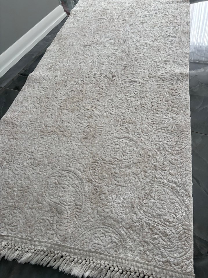Bej tonlarda, yumuşak dokulu ve hafif kabartmalı paisley desenli klasik tarzda halı. Püsküllü kenarları vardır. 80 150 yolluk Isteyenlere takım yapabılır elımde ıkı adet mevcuttur adet fıyatıdır ıkılı alım degıl