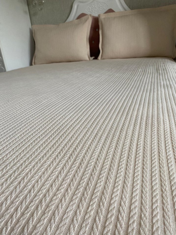 Pastel tonlarda, örgü desenli bej renk yatak örtüsü ve uyumlu yastık kılıflarıyla yatak odanıza yumuşak ve rahat bir dokunuş katıyor. ️