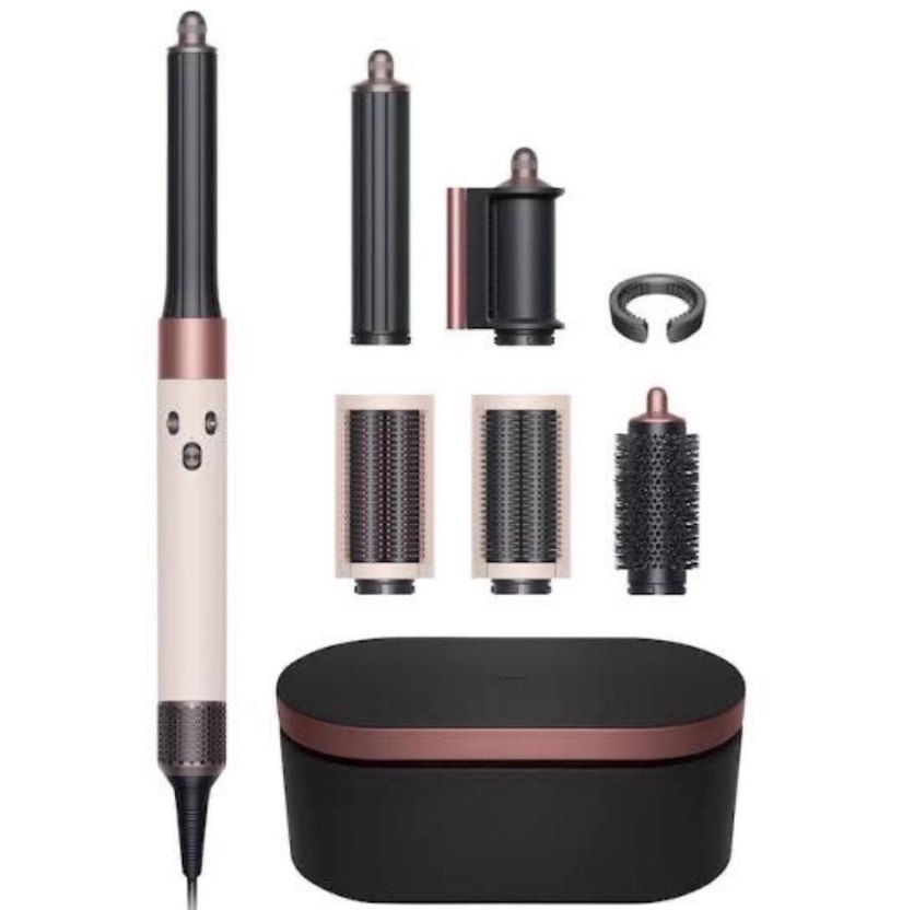 Bej renkli saç şekillendirici seti, farklı şekillendirme başlıkları ve saklama kutusuyla birlikte gelir.