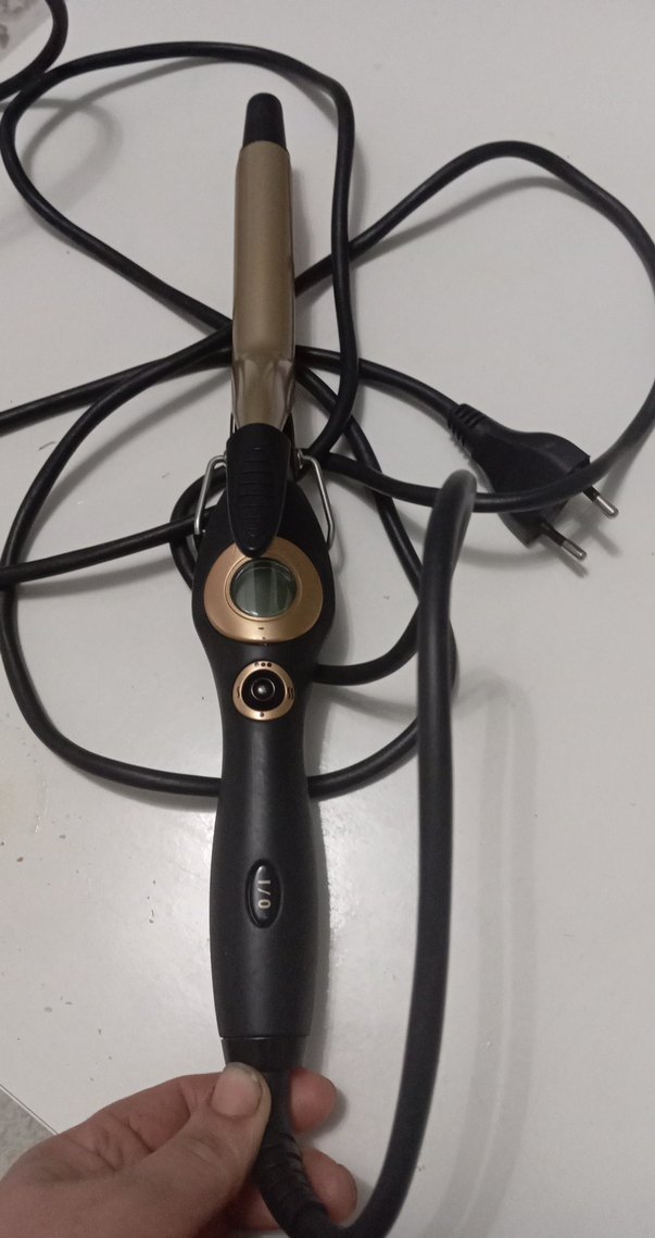 Dijital ekrana sahip, bej renk varilli ve siyah saplı saç maşası. Açma/kapama düğmesi ve takılabilir kablosu bulunur. kablo uzunluğu 2,5 metredir