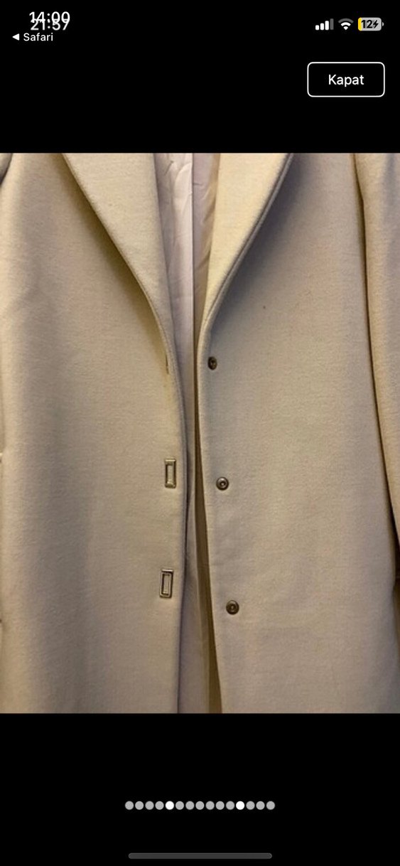 Bej renkli, düğmeli ve klasik yakalı, yumuşak kumaştan kaban. Soğuk havalar için uygundur. Kuru temizleme gerektirir