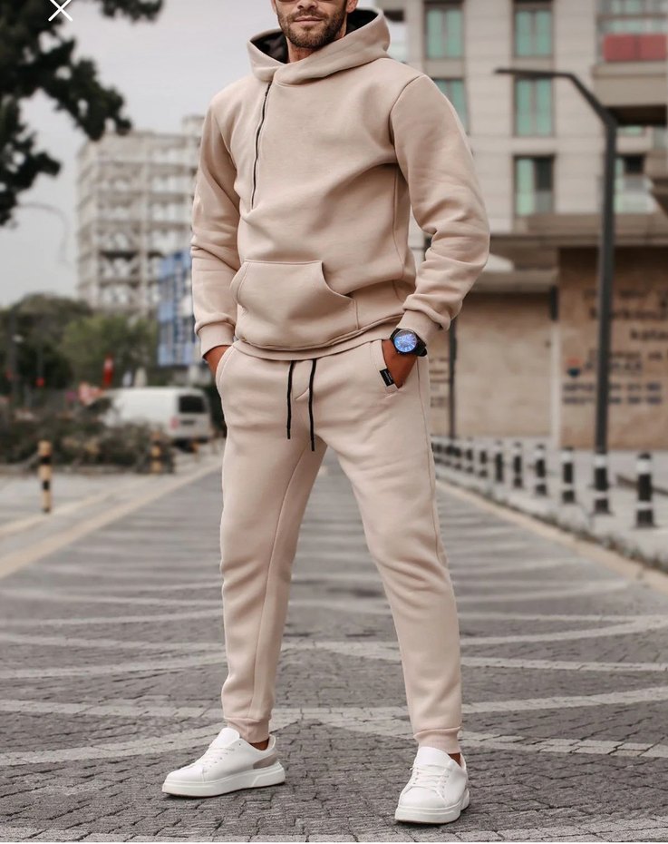 Dar paça kapüşonlu kalın bej erkek eşofman takımı