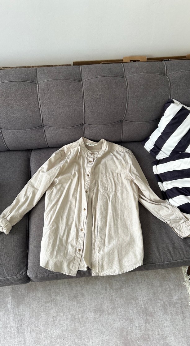 Düğmeli önü, uzun kollu ve yakalı, bol kesim beyaz keten gömlek. Günlük rahat kullanıma uygundur. 13 14 yaş