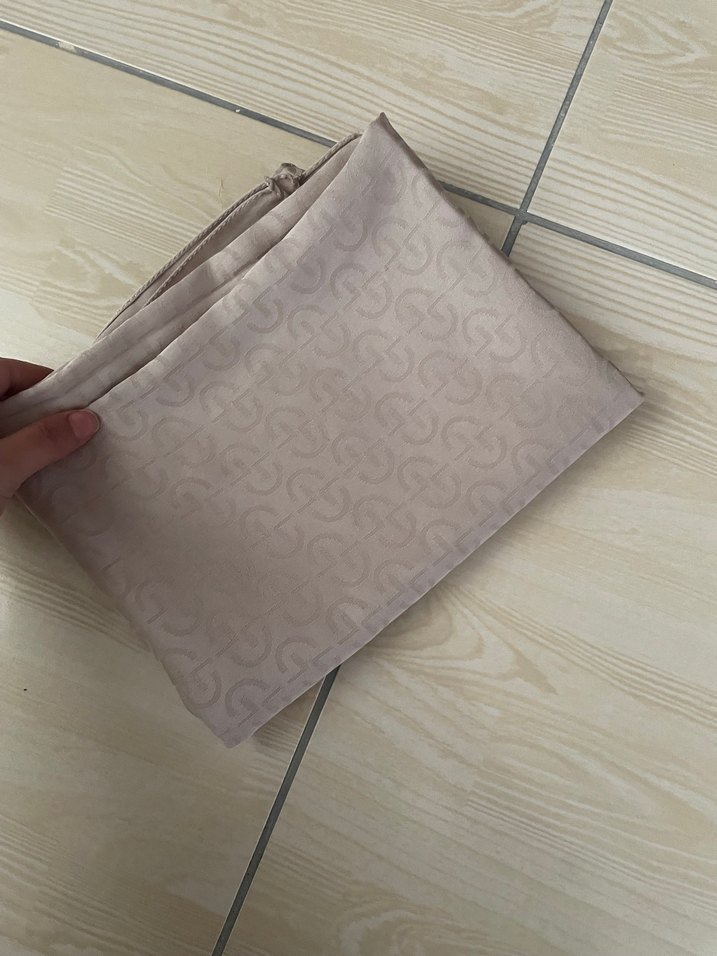 Bej renkli, fermuarlı, sentetik kumaştan yapılmış kadın şalı, minimalist ve çağdaş tasarıma sahiptir.