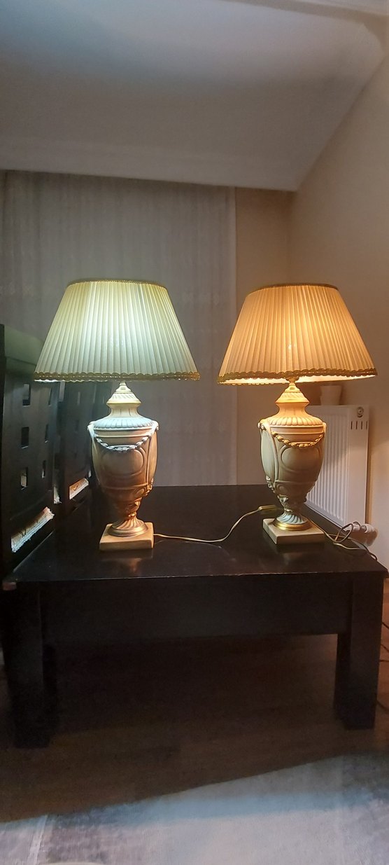 Bej renkli, pileli şapkalı klasik masa lambaları, yumuşak ve sıcak aydınlatma sağlar. Her odaya sıcaklık katar. ️boy 70cm