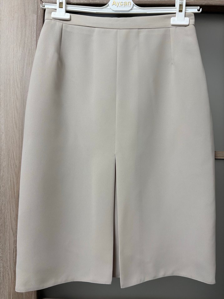 Ürün 44 beden, bej renk, dar kalıp, yüksek bel, arka kısmı rahat giyim amacıyla fermuarlı, ön kısmı açılmayan yırtmaç detaylı, içi astarlı kumaş etek, hiç kullanılmadı, bedenime küçük geldiği için satıyorum