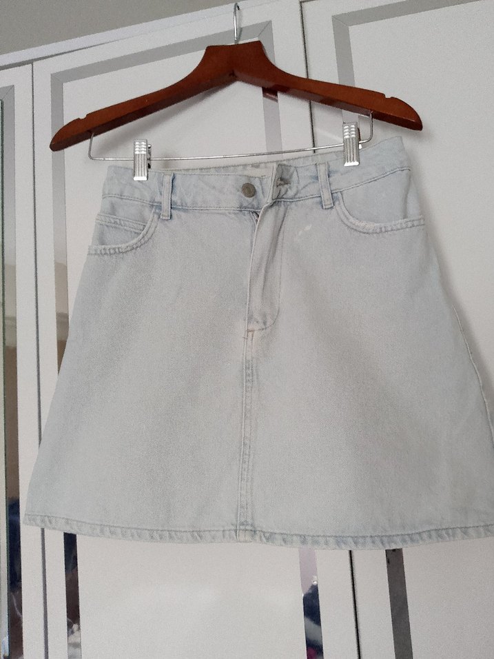 Bej renk midi uzunlukta, bol kesim denim mini etek. Desensiz ve rahat kesimiyle günlük sokak stili için uygundur.