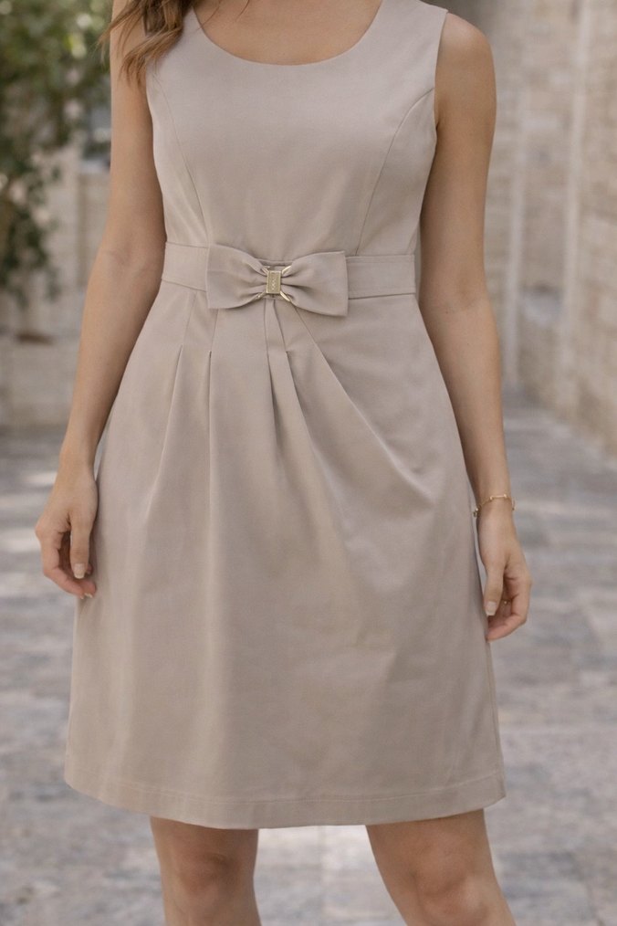 Kendinden kemerli ve fiyonk detaylı midi boy (diz altı), kolsuz elbise. İstenirse fiyonk sökülerek de kullanılabilir. Parlak kumaşlı, temiz kullanıldı, hiç bir kusuru yok. Dolabımda kaliteli markalarda temiz benzer ürünler mevcut. İki kol arası 42 cm, bel 36 cm, boyu 95 cm, yırtmaç boyu 12 cm. #Krem #camel #sütlükahve